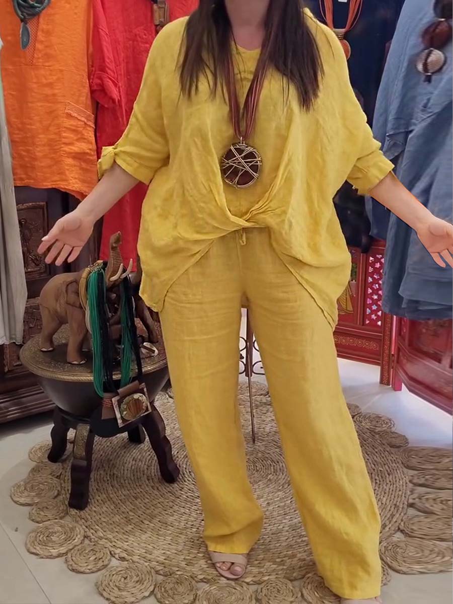 Women's Solid Color V-Neck 3/4 Sleeves Twisted Top Casual Linen Wide Leg Pants Two-Piece Set