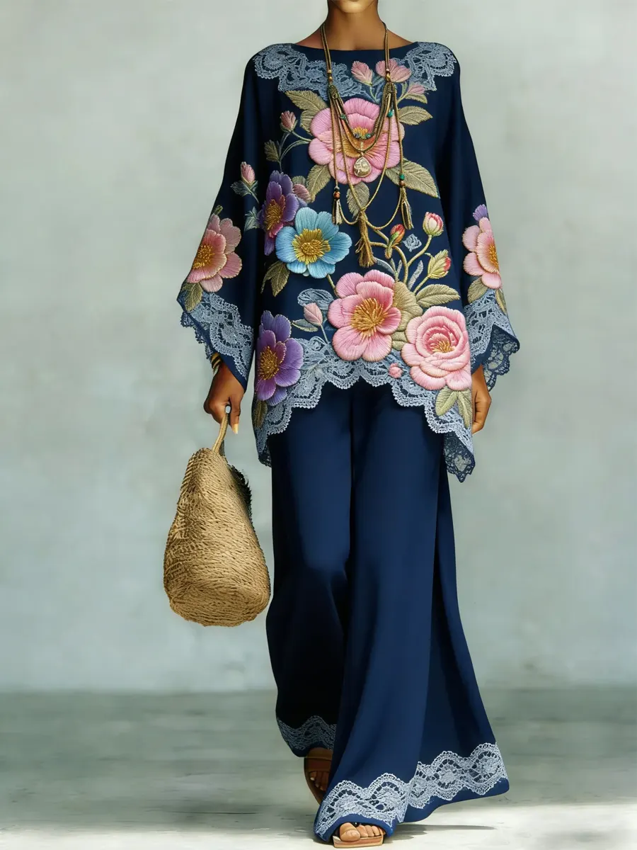 Women's Vintage Ethnic Floral Art Comfortable Loose Cotton Linen Wide-leg Pants Two-piece Set