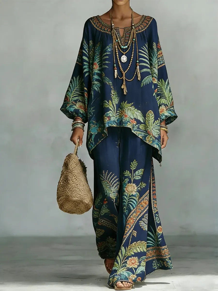Women's Vintage Floral Art Comfortable Loose Cotton Linen Wide-leg Pants Two-piece Set