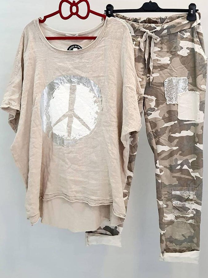 Relaxed And Casual Bohemian-style Linen Top And Printed Trousers Two-piece Set