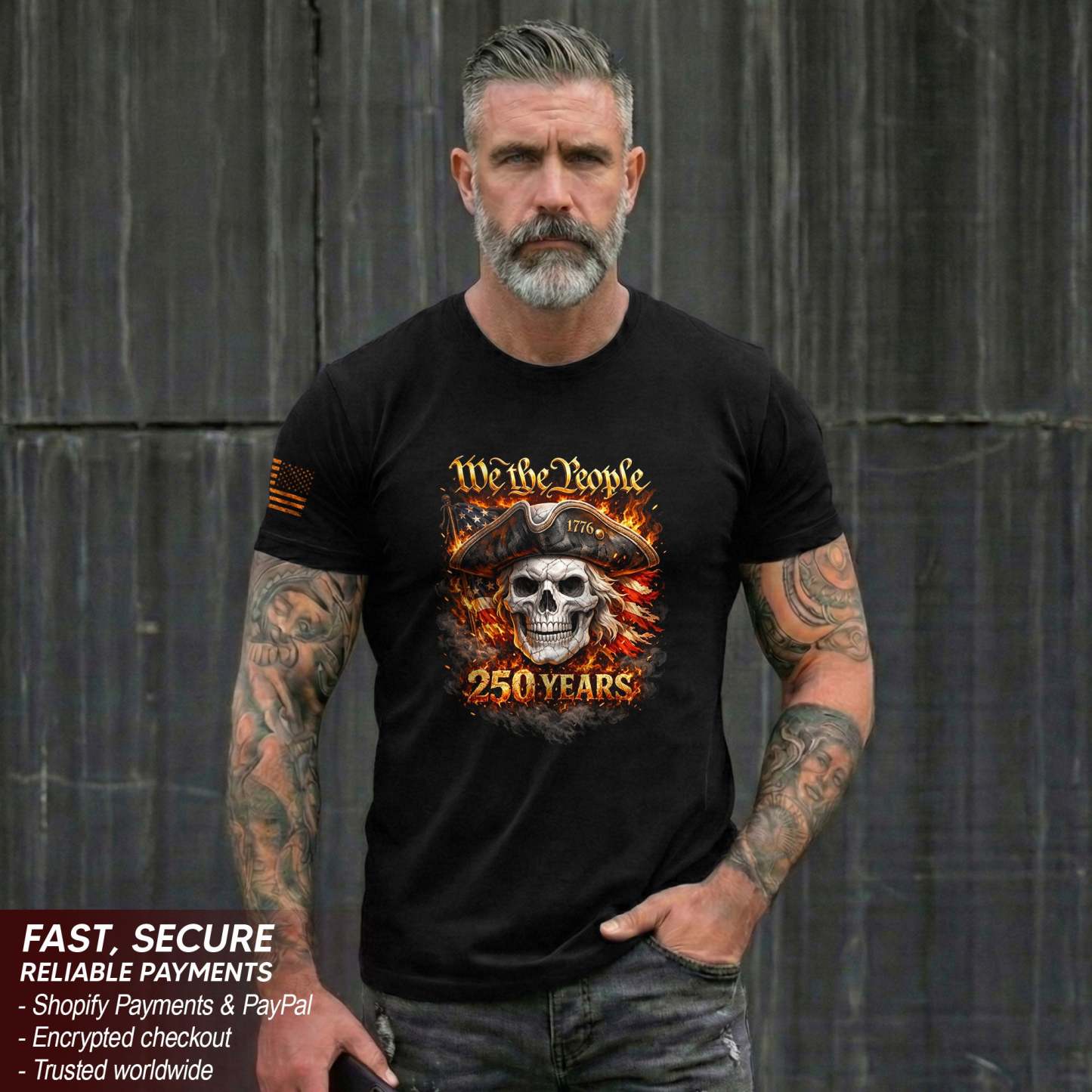 America 250 Years Patriotic Skull T-Shirt - 1776-2026 "We The People" Flaming Flag 250th Anniversary Tee