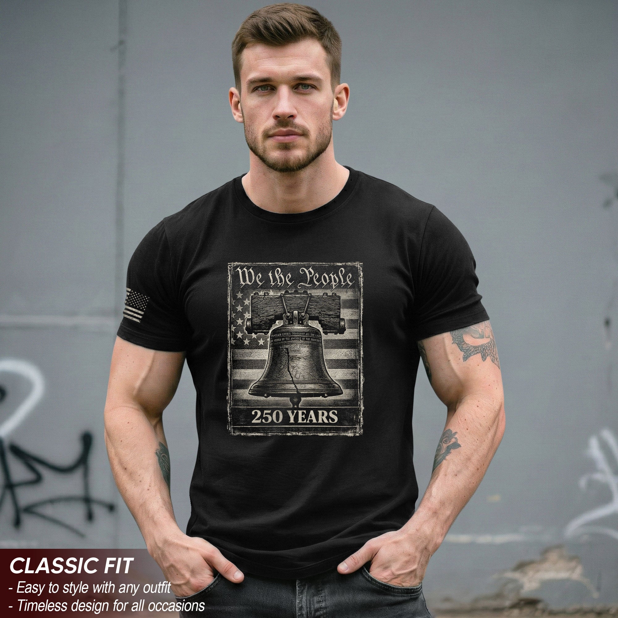 Blending We The People with timeless patriotic symbolism, this anniversary tee celebrates 250 years of independence and reflects the courage and conviction that continue to define the American spirit.
