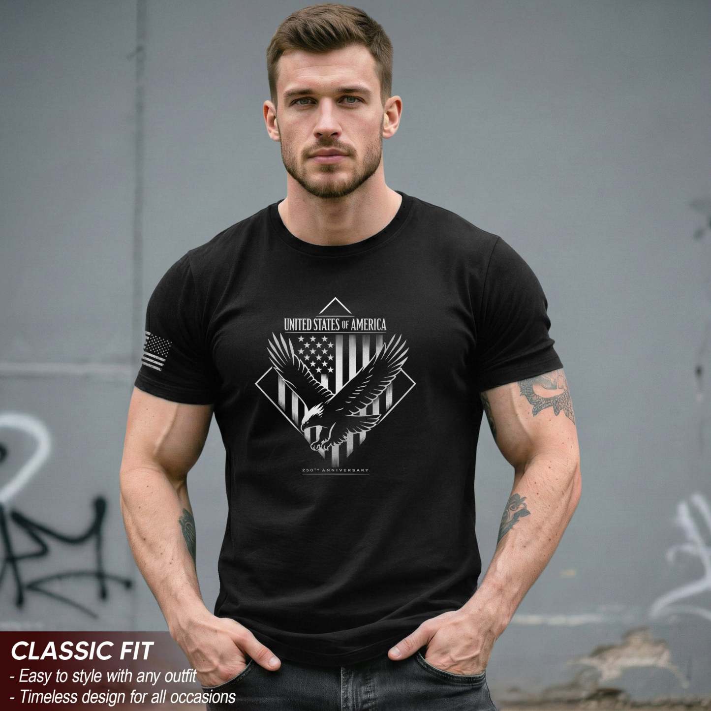 Celebrating the historic 250th anniversary milestone, this minimalist tee honors 250 years of American independence with subtle strength and refined patriotic expression.