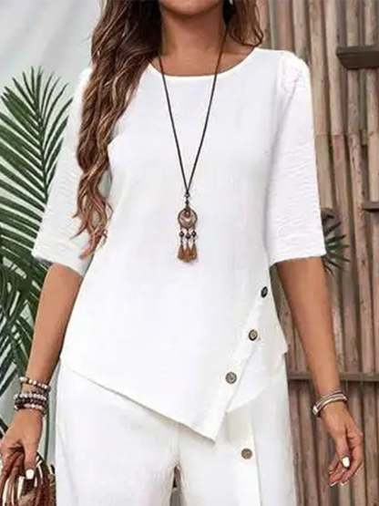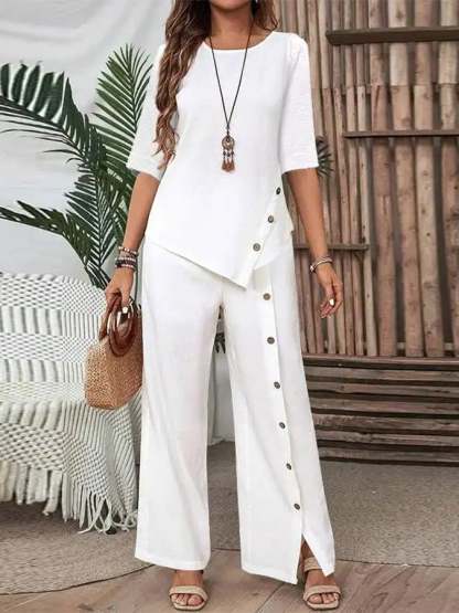 Women's Casual Button Short Sleeve Shirt Irregular Hem Pants Set