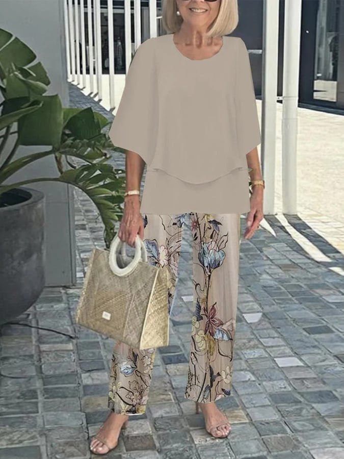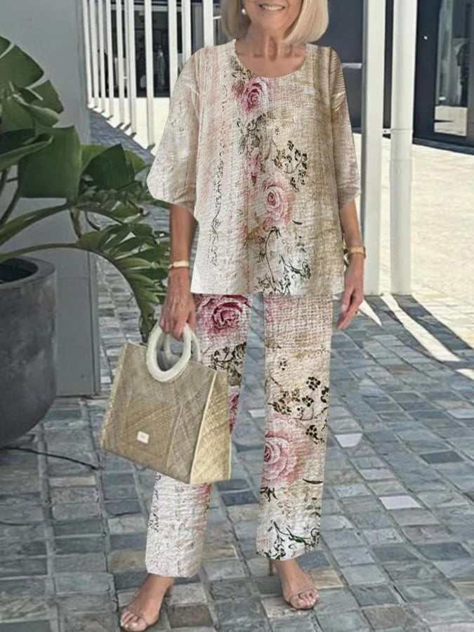 Women'S Casual Round Neck Mid-Sleeve Top With Printed Pants Set Two-Piece