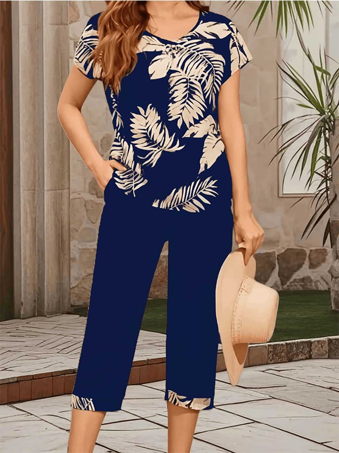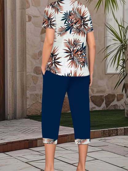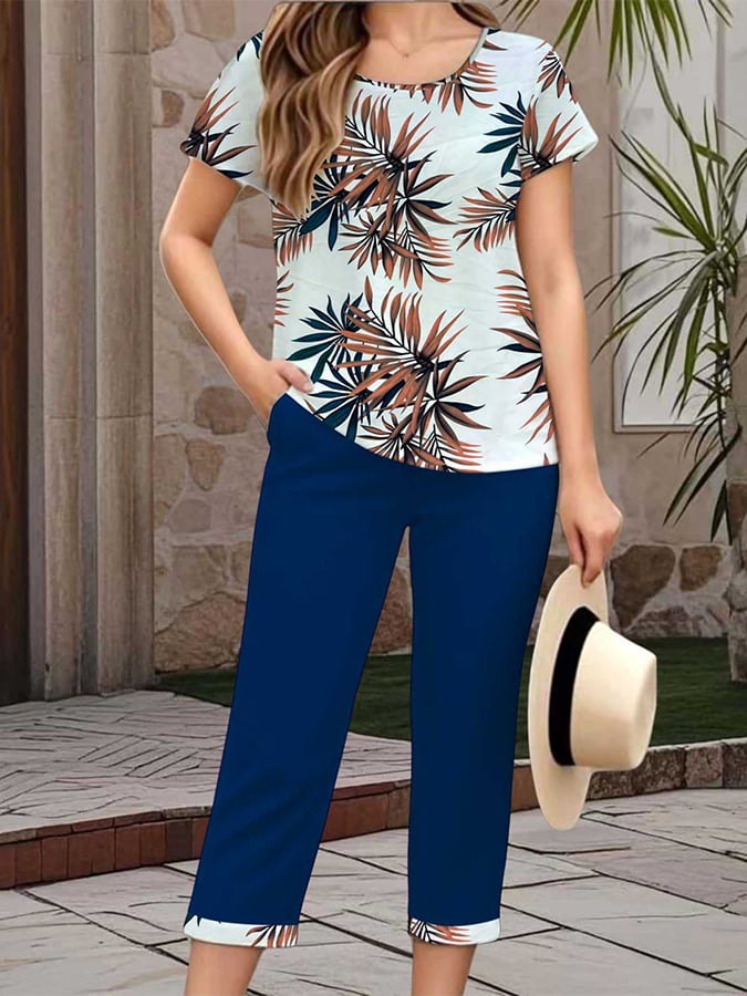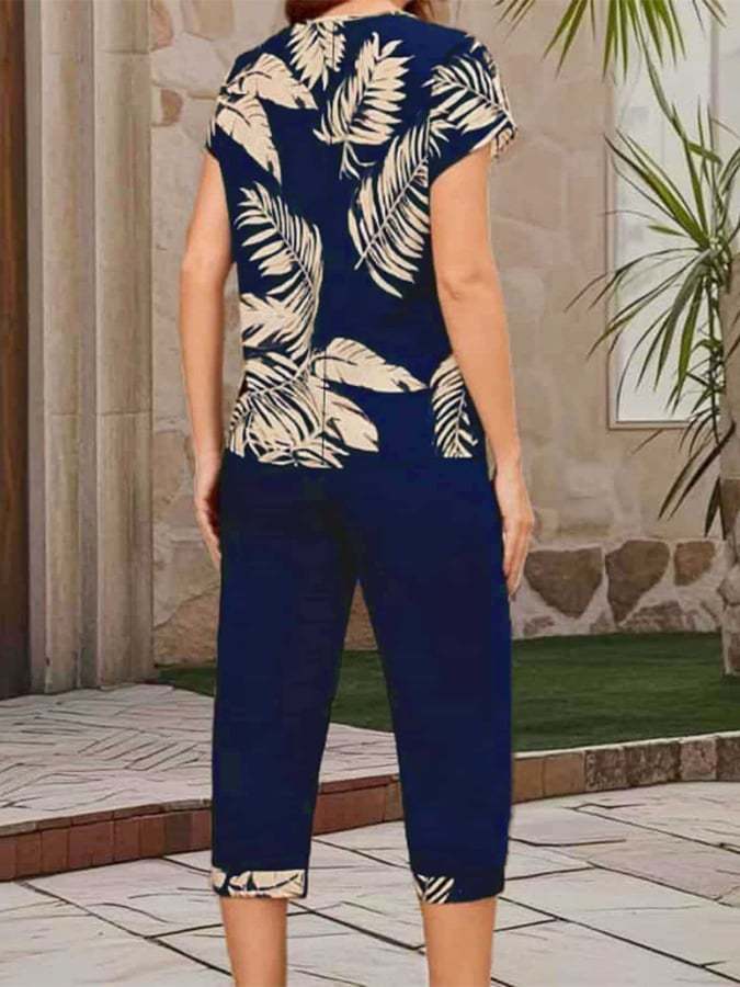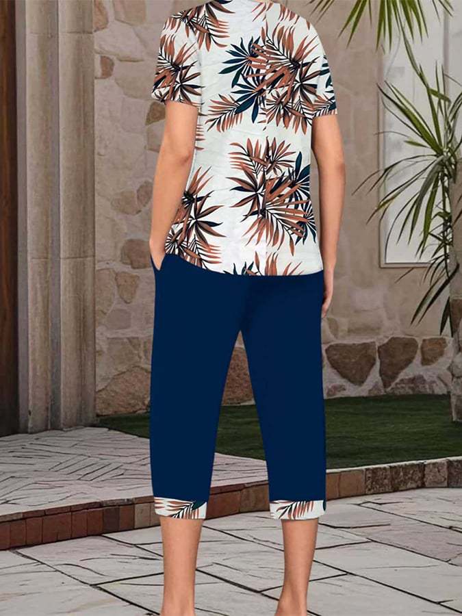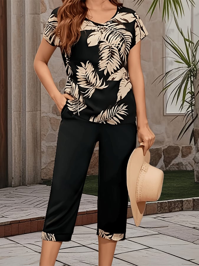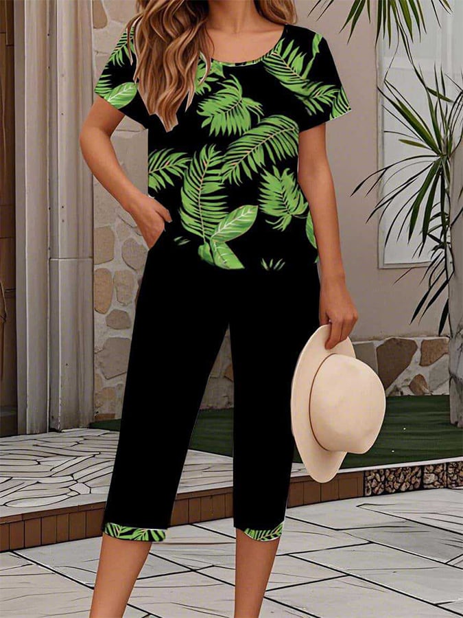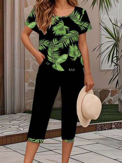 Women'S Casual Round Neck Short Sleeve Cropped Pants Printed Set