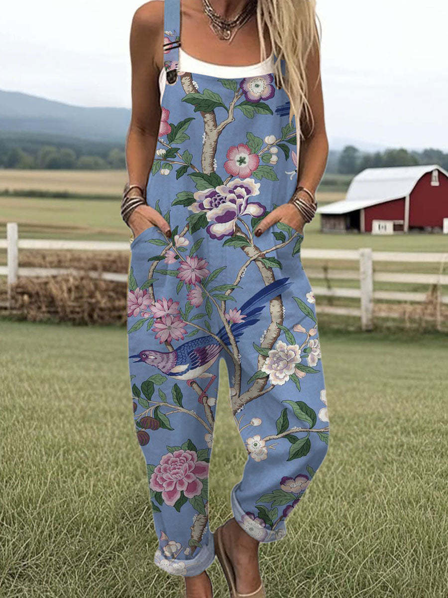 Women's Vintage Flower Art Print Casual Cotton + Polyester Wide Leg Jumpsuit