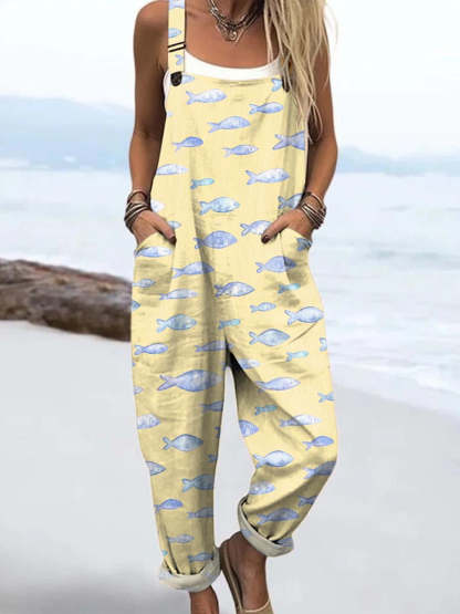 Women's Yellow Creative Cute Fish Print Casual Cotton + Polyester Wide Leg Jumpsuit