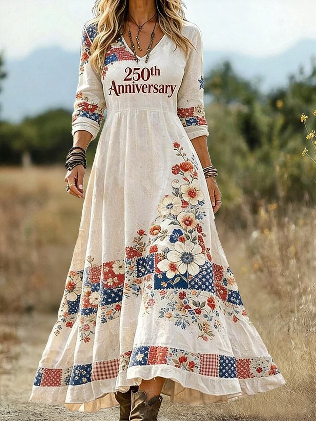Women America Flag Spring Summer Dress Floral V Neck A-Line 250th Anniversary Letter Pattern Vintage Maxi Dress