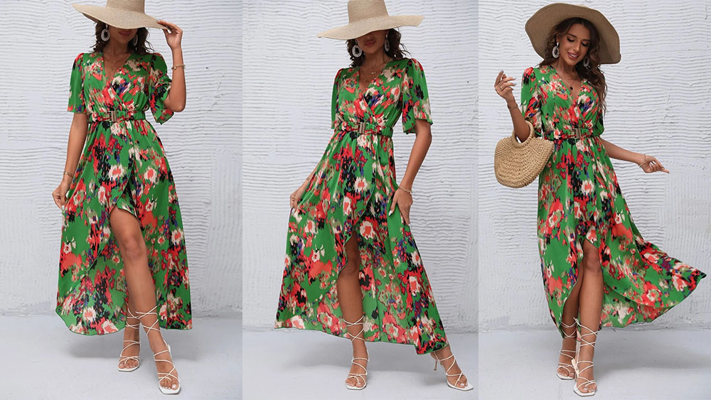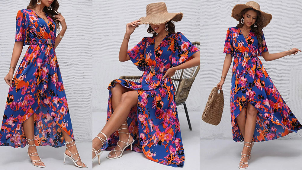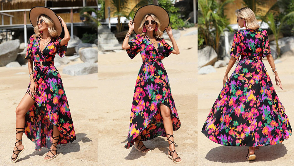 - Features: Maxi Dress For Women Features Sexy Wrap V Neck, Short Sleeve, Relaxed Fit, High Waist, Allover Floral, Polk Dot Print, Full Length Long Maxi Dress , Asymmetric Ruffle Trim At The Bottom, High Split At One Side, Wrap Belt At The Waist