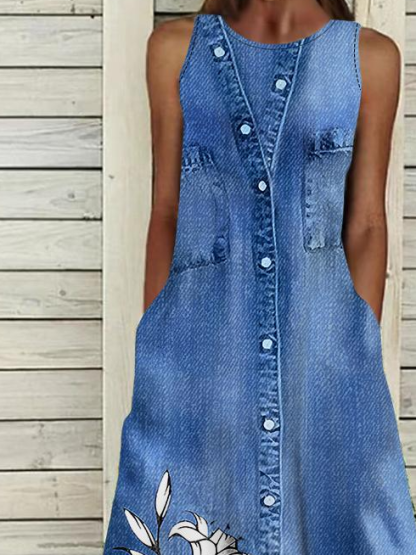 Loose Vintage Faux Denim Print Graphic Others Dress With No