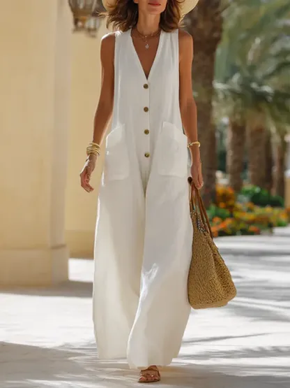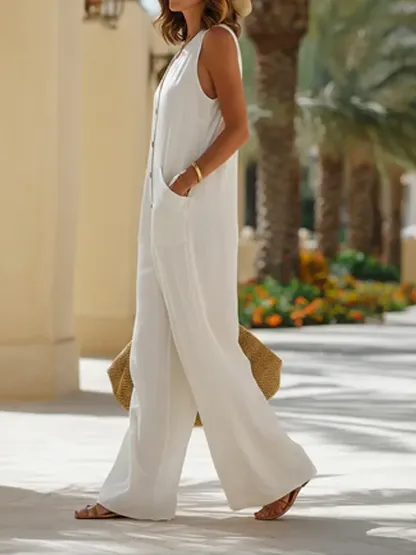 Simple Vacation Cotton Linen Sleeveless Jumpsuit