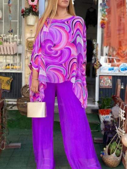 Women Colorful Chiffon Set Summer Casual Crew Neck Printed Two Piece Suit