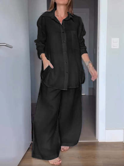 Women Solid Color Lapel Long Sleeve Cardigan Shirt High Waist Pocket Wide Leg Pants Set