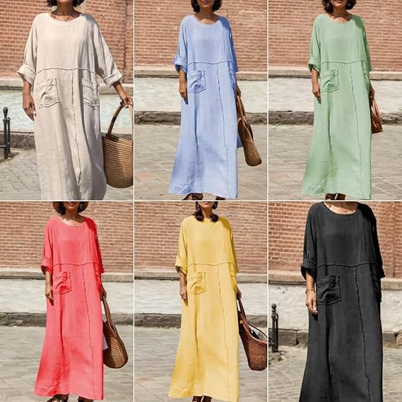Women's Maxi Dress Solid Plus Size Loose Cotton Linen Long Dresses with Pockets