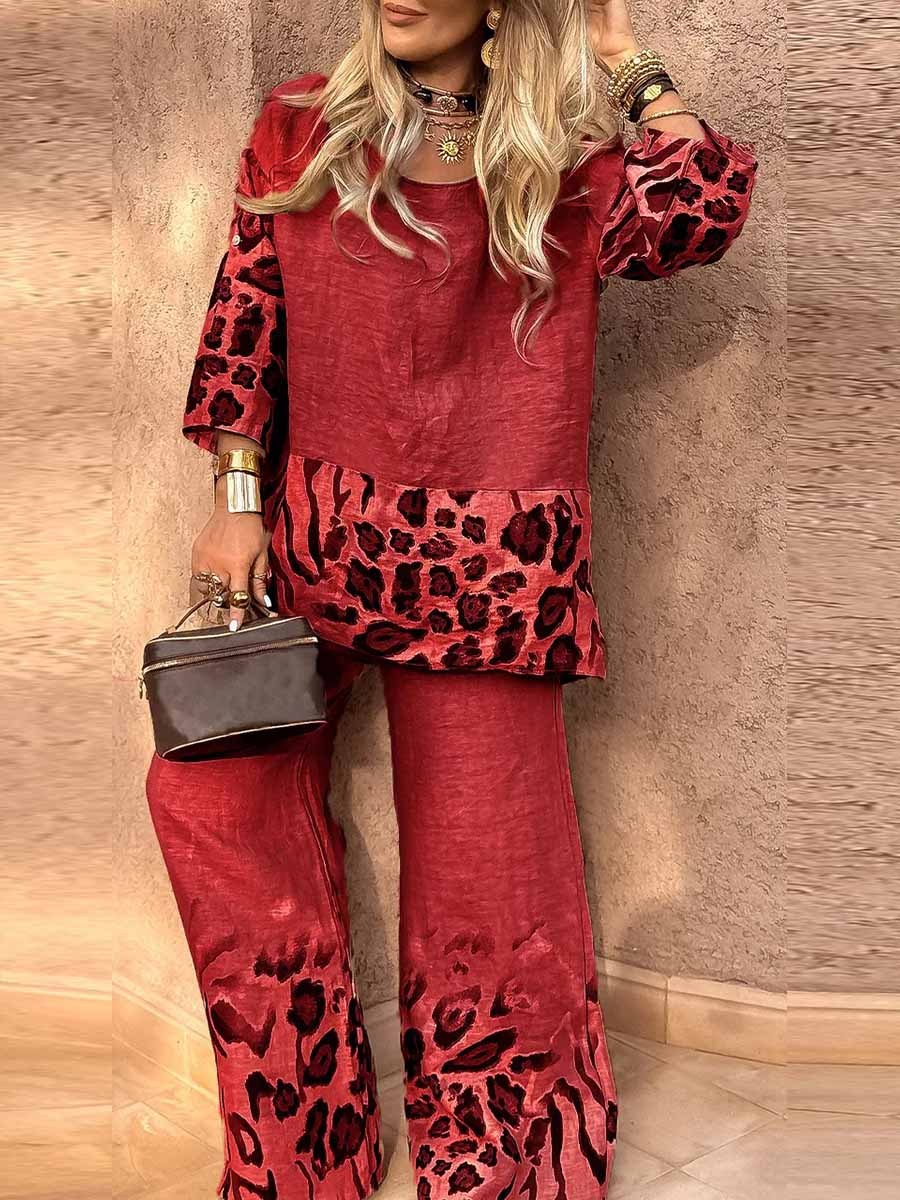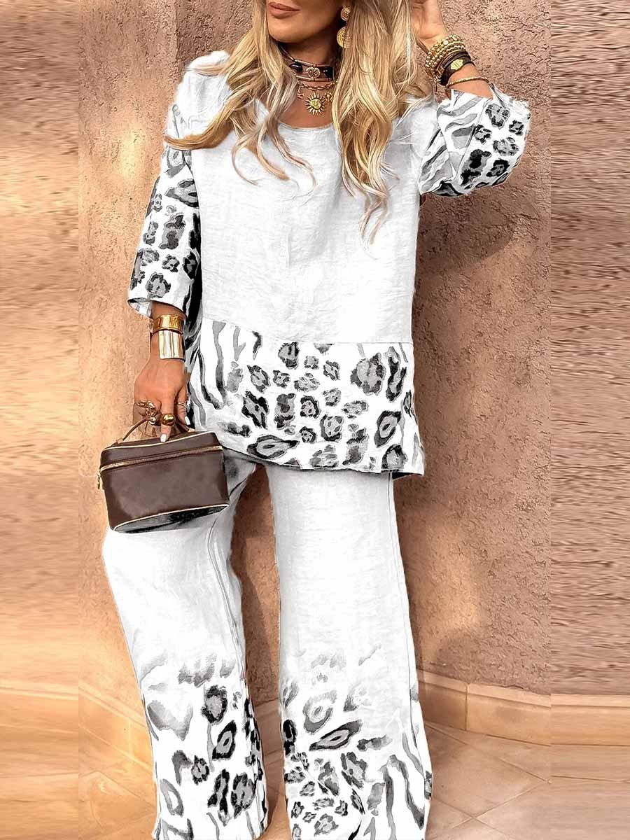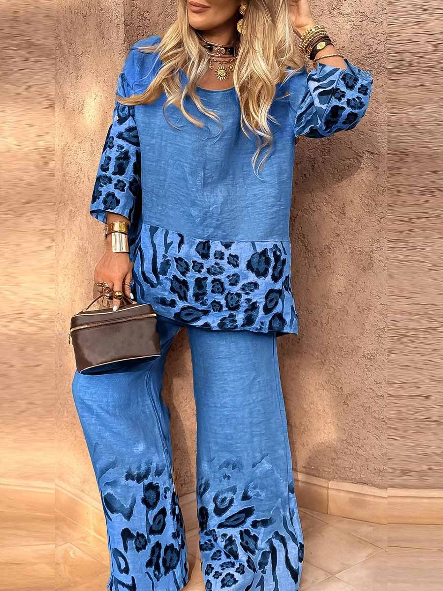 Women's Round Neck 3/4 Sleeves Casual Loose Leopard Print Tops High Waist Leopard Print Positioning Print Wide Leg Pants Set