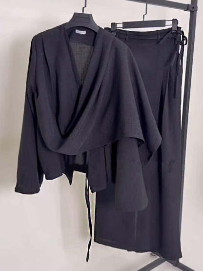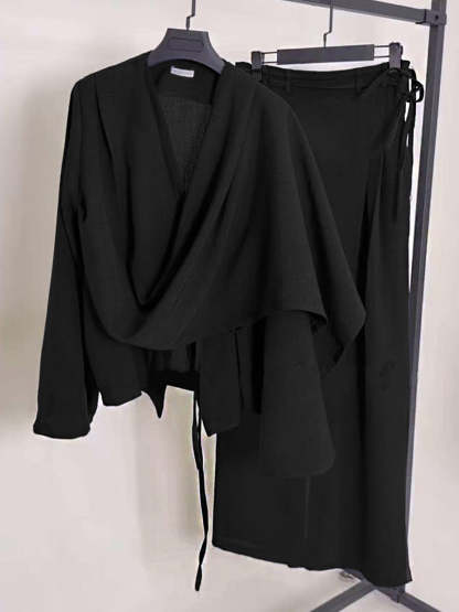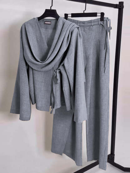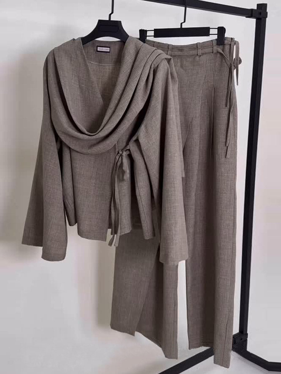 Women's V-neck Long-sleeved Lace-up Loose Tops High-waisted Lace-up Casual Wide-leg Pants Linen Suit