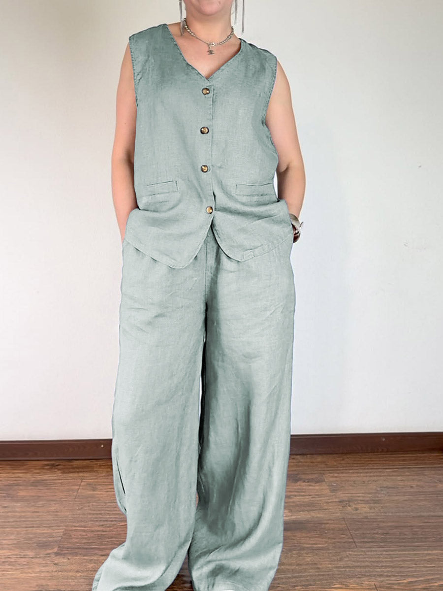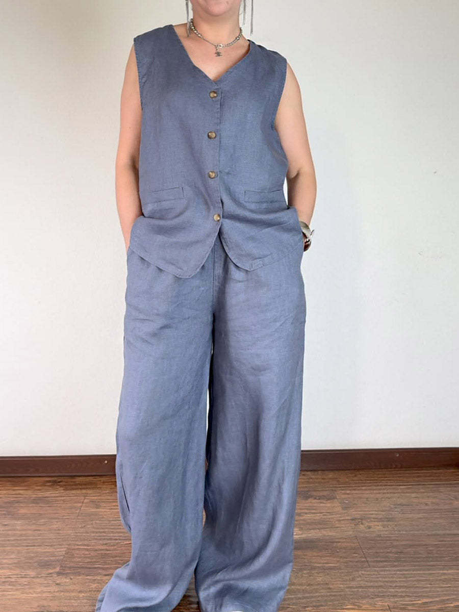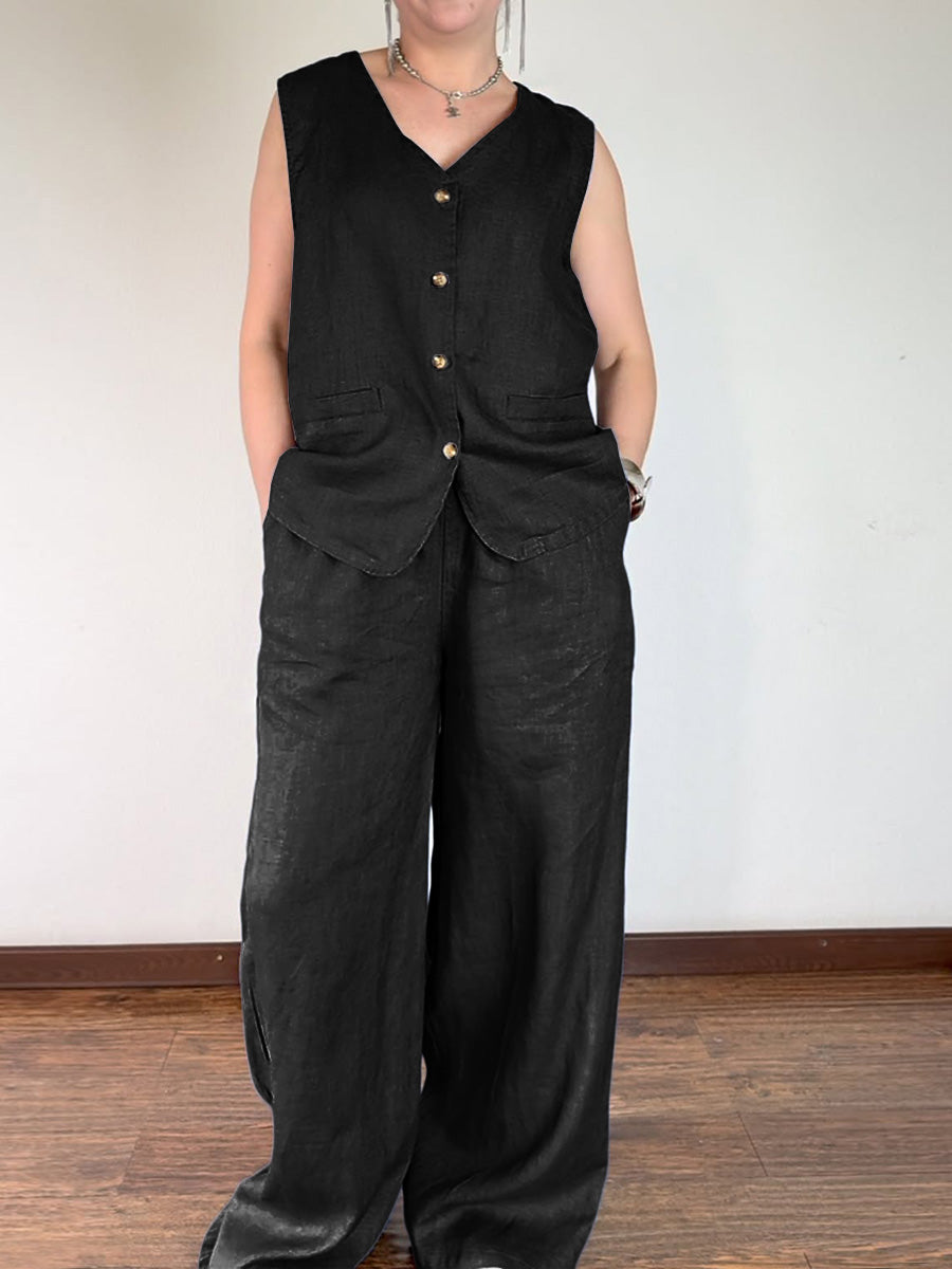 Women's V-neck Sleeveless Single-breasted Vest Top High-waisted Casual Wide-leg Pants Linen Suit