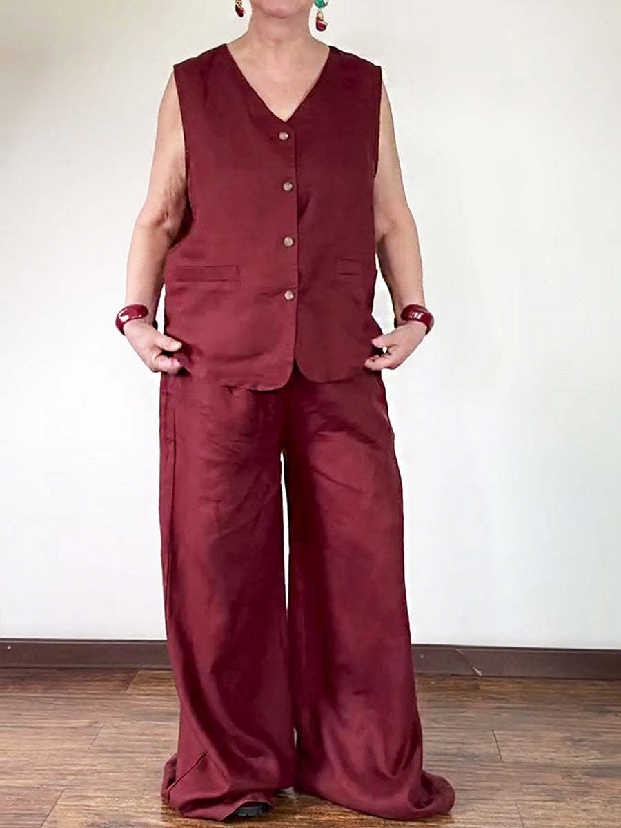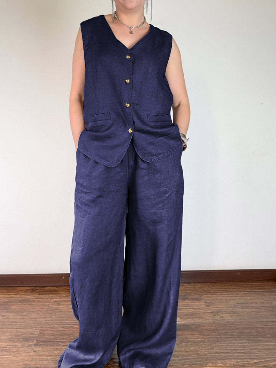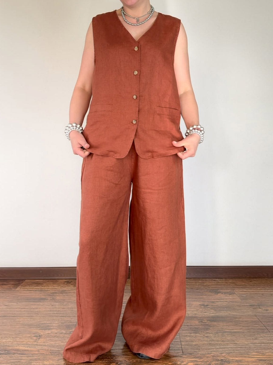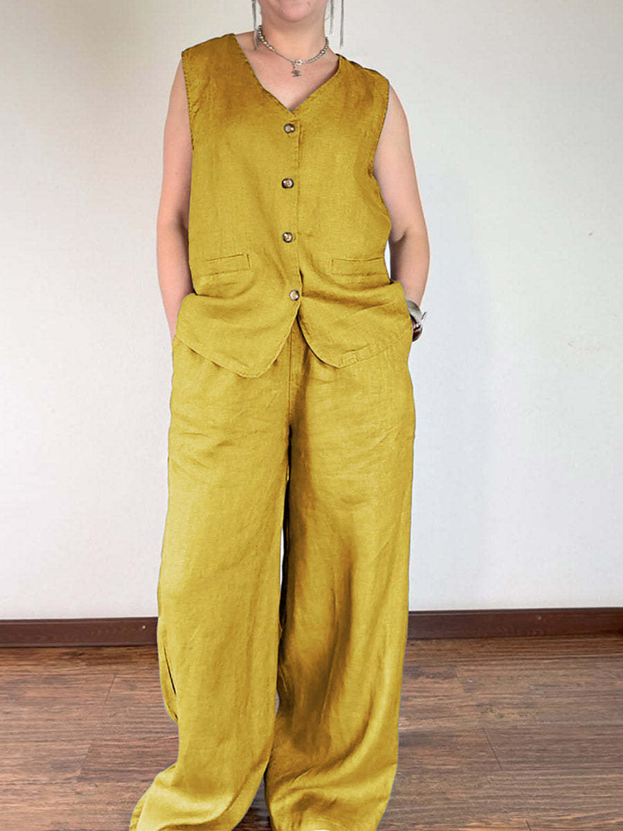 Women's V-neck Sleeveless Single-breasted Vest Top High-waisted Casual Wide-leg Pants Linen Suit