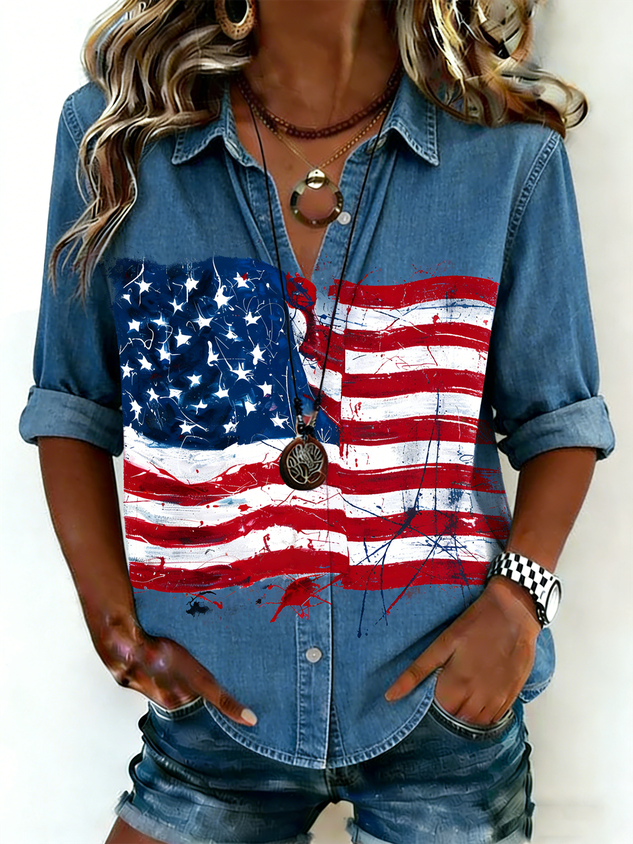 Casual Faux Denim Print Graphic Others Loose Shirt