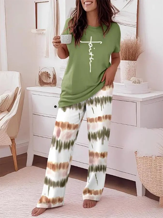 Women'S Casual Round Neck Mid-Sleeve Top With Printed Pants Set Two-Piece