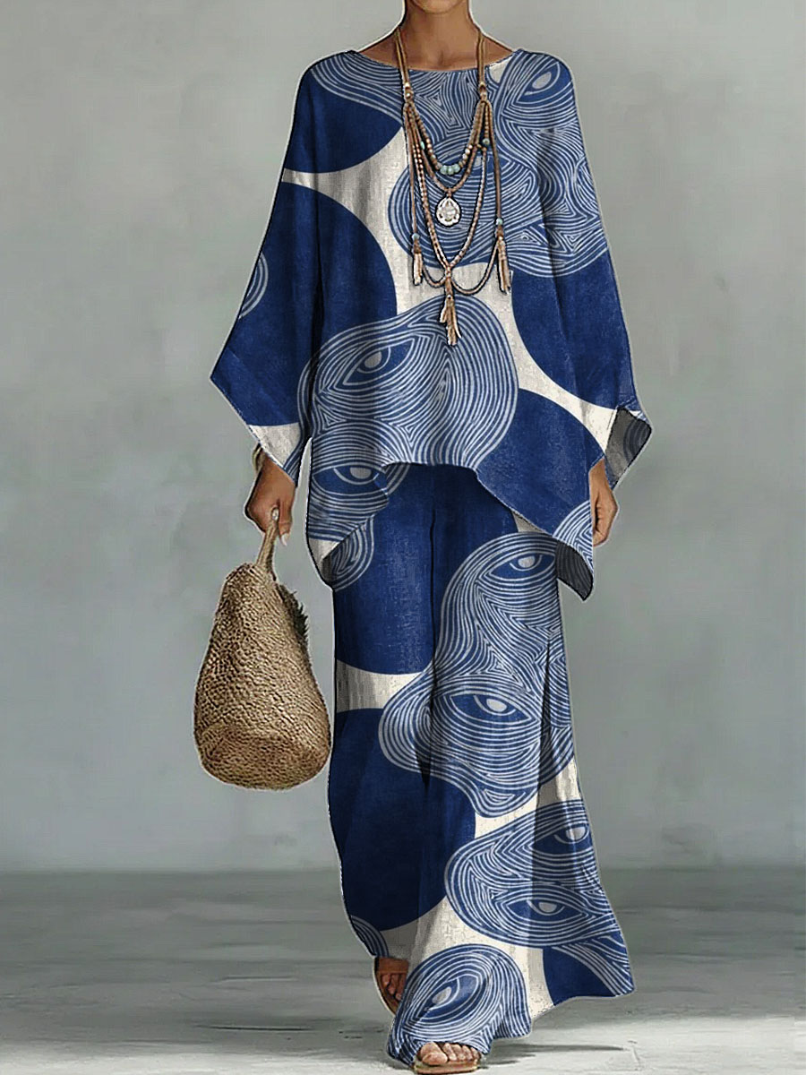 Women's Geometry Print Linen Cotton Top And Wide-leg Pants Two-piece Set.