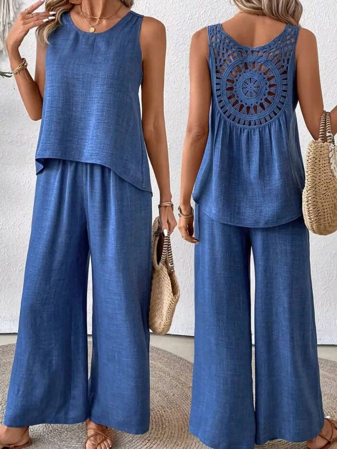 Women's Round Neck Sleeveless Casual Loose Top And High-waisted Loose Wide-leg Pants Cotton And Linen Set.