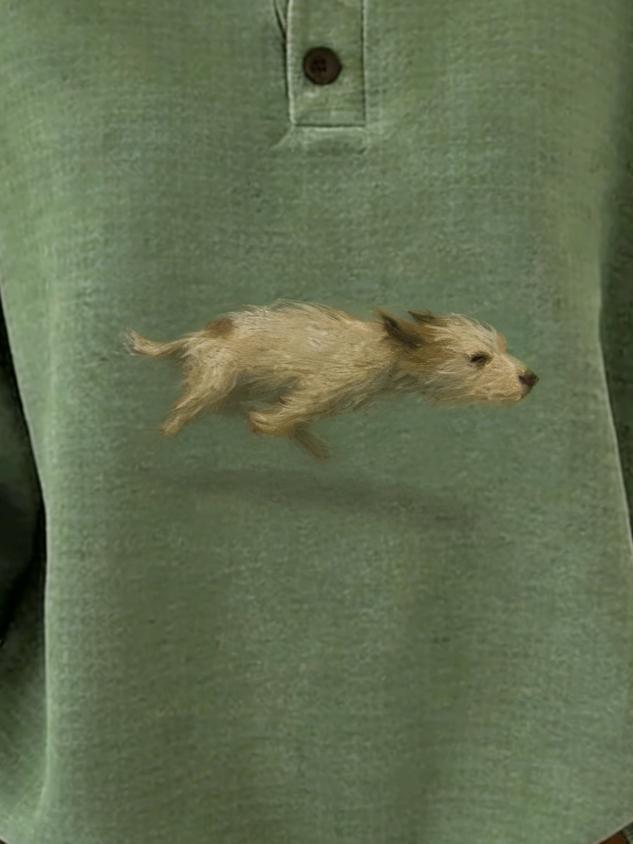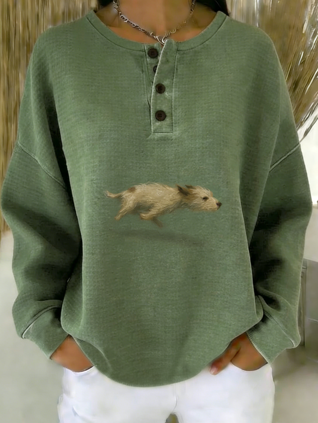 Dog Loose Print Button-Up Casual Waffle Knit Sweatshirt