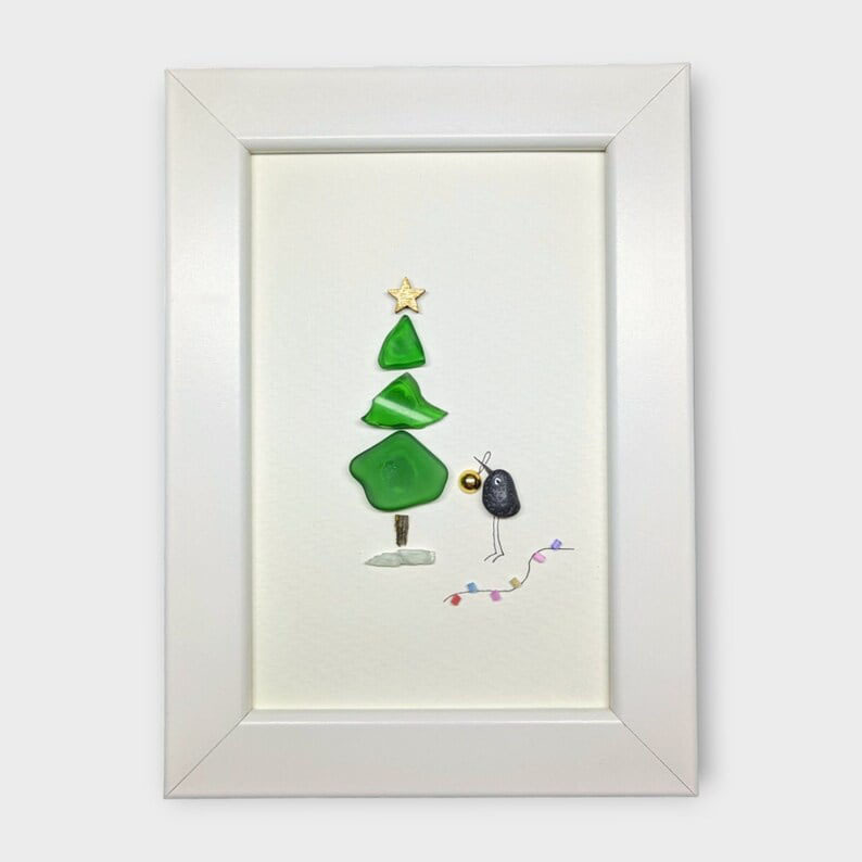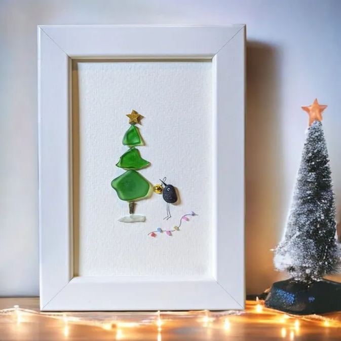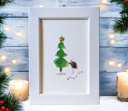 This beautiful sea glass pebble artwork features a Christmas tree crafted from sea glass. Next to the tree, a little bird made of pebbles holds a golden Christmas ornament in its beak. A festive glass garland lies nearby.It's a charming sea glass picture!