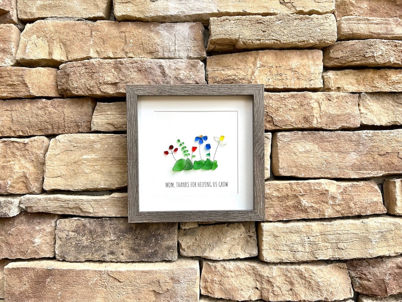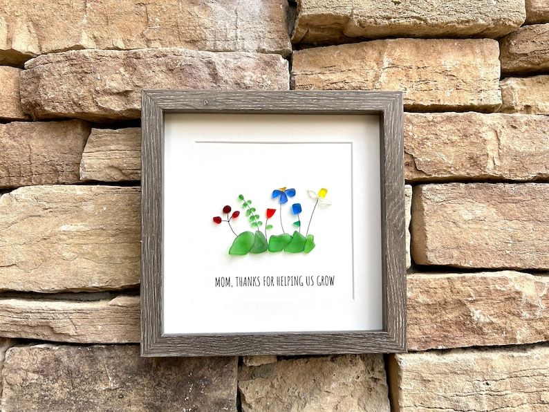 🌼Handmade floral sea glass artwork featuring a selection of wildflowers with the caption “MOM, THANKS FOR HELPING US GROW”. Perfect unique gift for mom.🥰