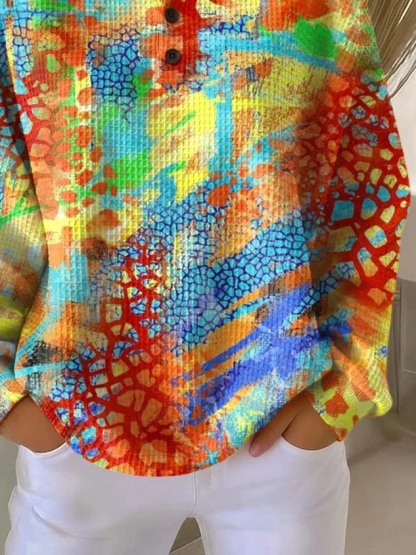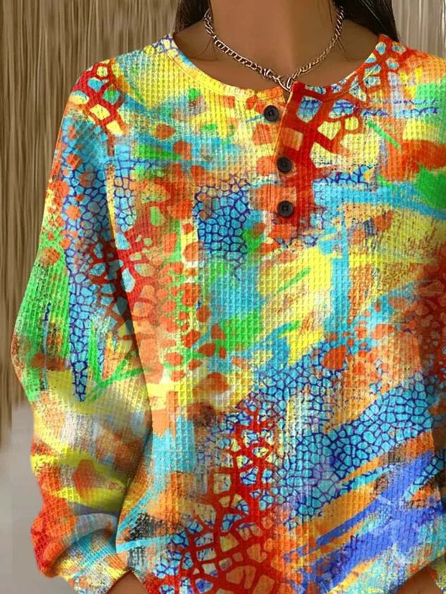 Women's Abstract Print Button-Up Casual Waffle Knit Sweatshirt