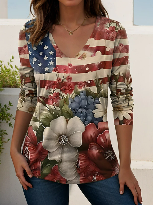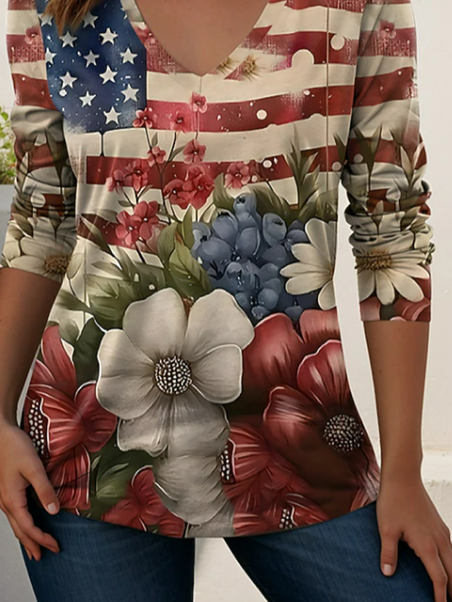 Women's Long Sleeve T-shirt Spring/Fall As Picture America Flag Printing V Neck Holiday Going Out Casual Top