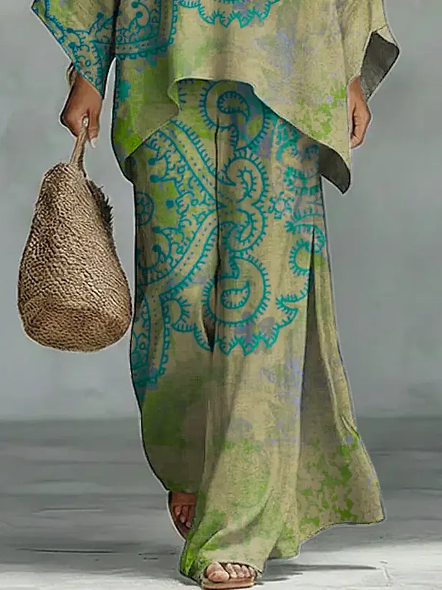 Women's Vintage Floral Art Comfortable Loose Cotton Linen Wide-leg Pants Two-piece Set
